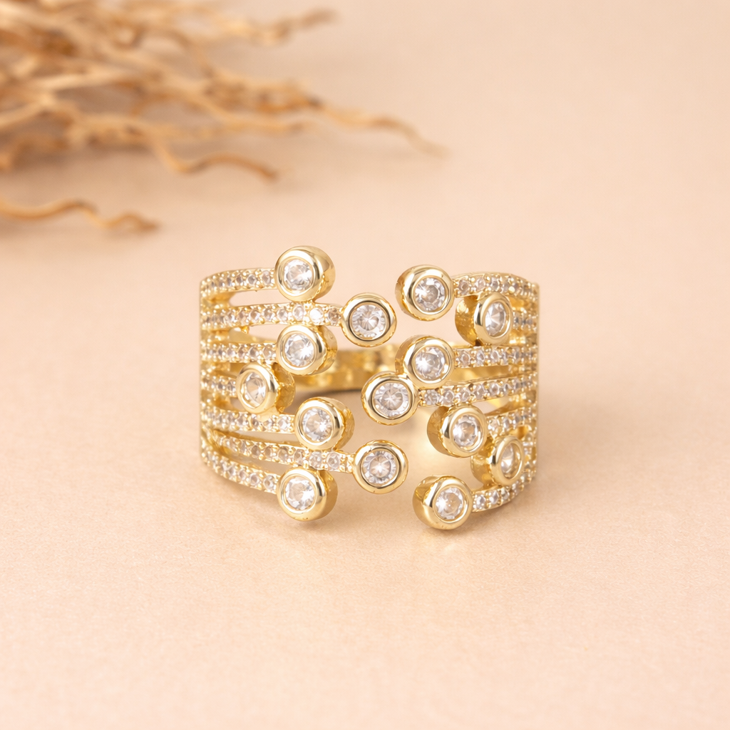 The Multi Shank Bubble Ring features an openwork, layered design that creates the illusion of stacked rings in one statement piece. Finished in a rich gold tone, its adjustable fit offers comfort with standout style.