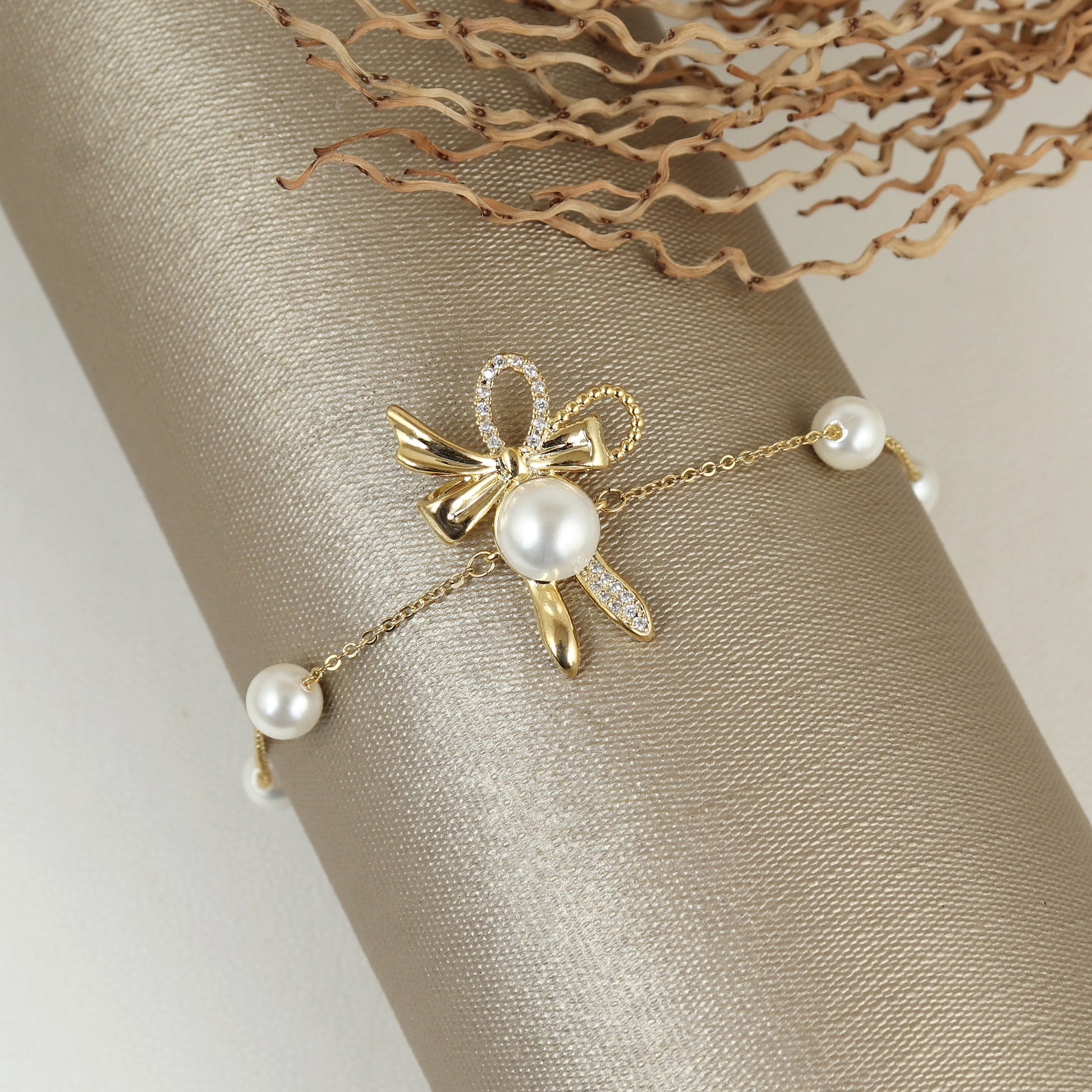 Delicate, feminine, and effortlessly chic – the Golden Elegance Pearl Bow Bracelet is the perfect blend of sophistication and charm. Featuring a beautifully crafted gold-tone bow adorned with sparkling crystals and a luminous pearl centerpiece, this bracelet exudes timeless elegance. The dainty chain is accented with additional pearls, adding a graceful finishing touch to this must-have accessory.